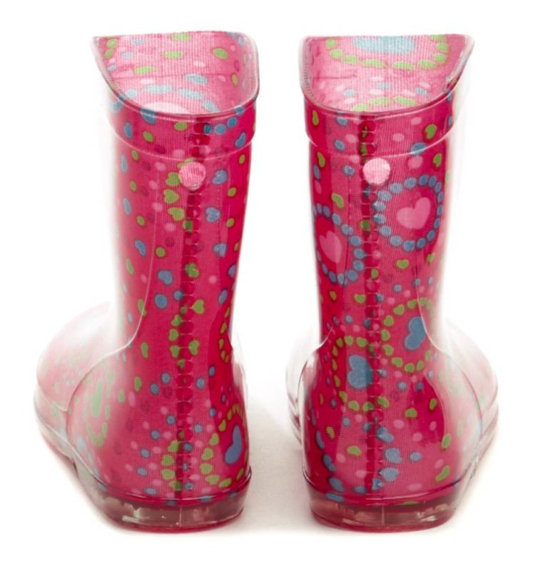 Obuv je vyrobena z průhledného gumového materiálu. Vnitřní část obuvi je vybavena textilní podšívkou, která tvoří barvu a motiv holínky.