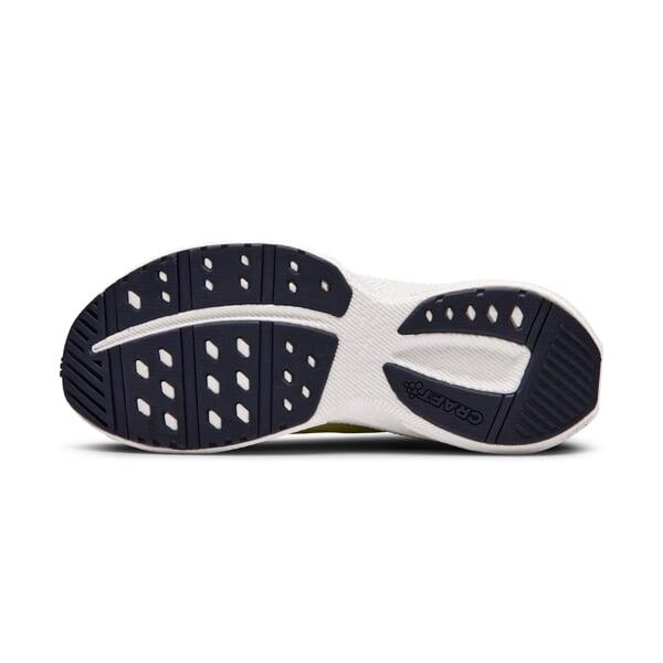 Podešev nabízí hladký, vysoce přilnavý grip, který je ideální především na asfaltu a zpevněných cestách, kde bota vyniká svou stabilitou a spolehlivostí. Tento model je vhodný pro běžce všech výkonnostních úrovní, kteří hledají pohodlné a živé boty pro kombinaci tréninku rychlosti a objemu.