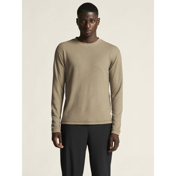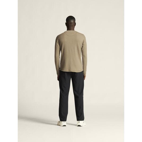 Toto triko je vyrobeno ze směsi vlny a viskózy, která kombinuje měkkost a funkčnost. Strukturovaný materiál ve vzoru waffle zajišťuje lepší izolaci i prodyšnost, což pomáhá udržovat optimální tělesnou teplotu při méně intenzivní aktivitě nebo v chladnějších dnech. Díky volnému střihu je pohodlné jak při sportu, tak při každodenním nošení. Triko lze využít jako spodní vrstvu v zimě nebo samostatně během mírnějšího počasí.