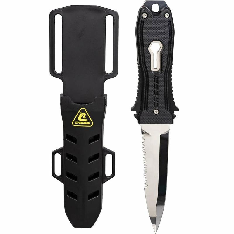 Kvalitný nôž na potápanie vyrobený z odolnej nerezovej ocele s vysokou odolnosťou voči korózii a vynikajúcimi mechanickými vlastnosťami. Jeho extrémne ostrá čepeľ je precízne vybrousená. Tento potápačský nôž je navrhnutý tak, aby bol ľahko manipulovateľný jednou rukou – jednoducho sa vysunie a zasunie do puzdra. Má dĺžku čepele 105 mm, celkovú dĺžku 210 mm a hrúbku čepele 3,8 mm. Nôž je možné uchytiť na žaket alebo na nohu pomocou 2 gumových remienkov, ktoré sú súčasťou balenia. Dôležité je pravidelne ho ošetrovať silikónovou vazelínou.