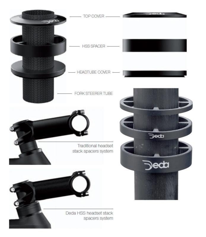 Inovativní DEDA H.S.S. systém distančních podložek, který umožňuje vložení distančních podložek přímo pod horním krytku pod představec, na rozdíl od tradičních systémů. To dává bicyklu zcela nový vzhled, který lépe odpovídá moderním trendům. DEDA H.S.S. vede k lepší integraci podložek a rámu a současně zvyšuje tuhost a zlepšuju manipulaci s kolem.