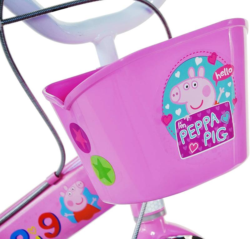 Detské kolo Dino Bikes 164R-PGS Prasiatko Pepa (v orig. Peppa Pig) 16 je tu pre všetkých, ktorí zbožňujú príbehy s prasiatkom Pepinou a jej kamarátmi. Kolo je odporúčané pre výšku dieťaťa 107-138 cm a pre deti od 5 rokov. Maximálna nosnosť kola je 60 kg.Kolo má lakované oceľové ráfiky 16" (16 palcov = 40 cm) a nafukovacie plášte. Súčasťou balenia sú prídavné balančné kolieska, ktoré sú vhodné pri učení rovnováhy na kole. Po získaní istoty pri jazde na kole je možné ich kedykoľvek odstrániť a jazdiť bez balančných koliesok. Za sedlom sa nachádza sedačka pre bábiky alebo plyšáky. Vpredu je košík, ktorý slúži na odkladanie a prevoz menších vecí alebo hračiek. Kolo má odľahčený rám z Hi-Ten ocele, prednú a zadnú čeľusťovú brzdu, ktoré sa ovládajú páčkami na riadidlách. Kolo má voľnobežné zadné koleso, tzv. "cvrčka", samozrejmosťou je tiež bezpečnostná koncovka riadidiel.