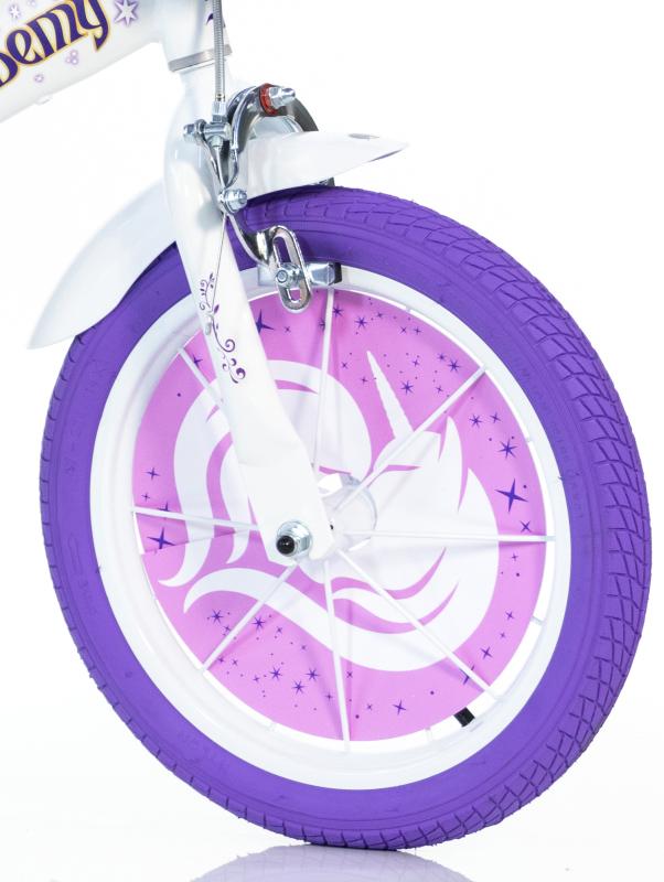 Dětské kolo Dino Bikes s licenčním potiskem Unicorn Academy - Jednorožec se vyznačuje propracovaným designem dávajícím kolu líbivý vzhled. Ke kolo patří i doplňky - s doplňky - plastový košík na řidítkách a plastový držák na panenky pod sedlem kola. Velkou výhodou všech našich kol italské výroby je, ŽE JSOU SEŘÍZENÁ PRO PROVOZ A NA 95% SMONTOVANÁ. Zbývá pouze nasadit řidítka, sedlo a připevnit případně blatníčky (pokud jsou součástí je kola). Kolo má ocelové ráfky 16' (palců = 41 cm), nafukovací pláště, volnoběh, bezpečnostní koncovku řidítek, přídavná balanční kolečka. Je doporučené na výšku postavy 107-127 cm. Minimální výška sedla od země je 50 cm, maximální cca 61 cm. Kolo má přední a zadní čelisťovou brzdu. Kolo je vyrobeno s odlehčeným, ale vyztuženým rámem z HiTech oceli, doporučené je pro pro děti od 5 - 6 let, nosnost kola je 45kg, hmotnost 9,40 kg. Kolo je baleno v bílé potištěné krabici 90 x 47 x 17 cm .