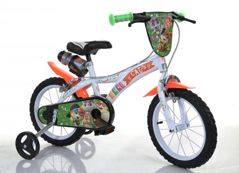 Dětské kolo Dino Bikes 616-CATS 44 Koček - Mňaukózní příběhy 16 má lakované ocelové ráfky 16" (16 palců = 40 cm) a nafukovací pláště. Součástí balení jsou přídavná balanční kolečka, která jsou vhodná při učení rovnováhy na kole. Kolo je doporučeno pro výšku dítěte 107-138 cm a pro děti od 5 let.