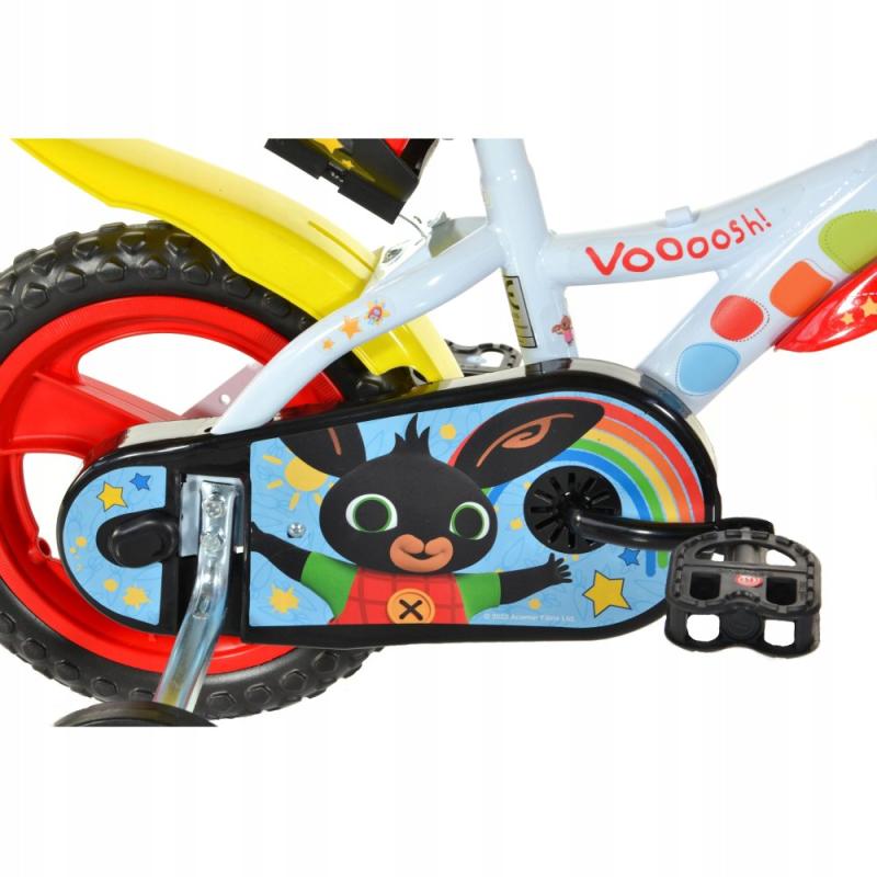 Dětské kolo Dino Bikes 612L-BG Králíček Bing 12 je překrásné kolo pro děti, které mají rády příběhy Králíčka Binga a jeho kamaráda Flopa. Kolo má kompozitová paprsková kola 12" (palců = 30 cm), plné pláště s pěnovou výplní EVA, což vylučuje možnost defektu a zároveň se nemusí dofoukávat.Kolo je doporučené na výšku 87-110 cm a orientační věk dítěte 3-5 let. Maximální nosnost kola je 40 kg.Kolo má bezpečnostní koncovku řidítek a držák s láhví na pití. Součástí balení jsou přídavná balanční kolečka, která jsou vhodná při učení rovnováhy na kole. Po získání jistoty při jízdě na kole je možné je kdykoliv odstranit a jezdit bez balančních koleček. Kolo má odlehčený rám z Hi-Ten oceli a přední čelisťovou brzdu.