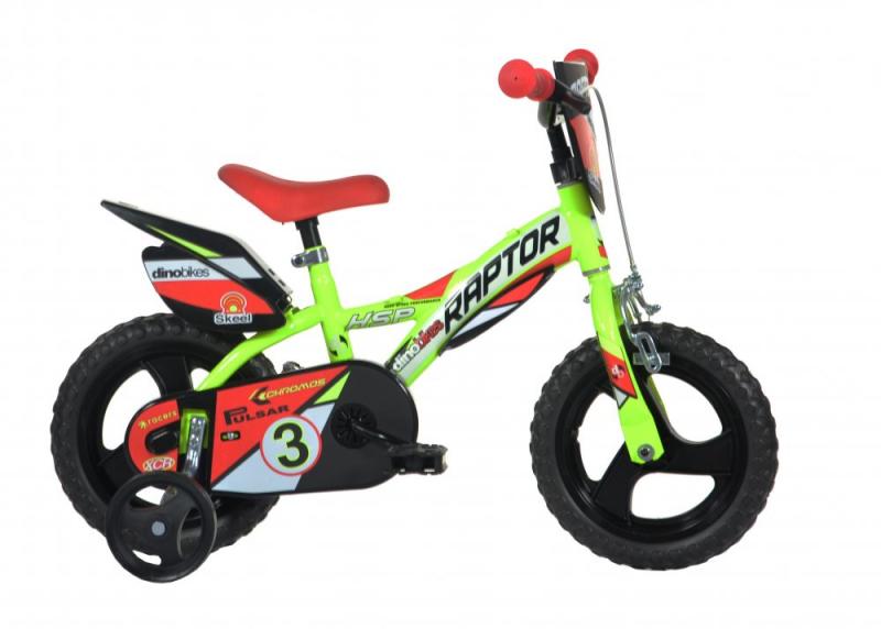 Dětské kolo Dino Bikes 612L-RP Raptor 12 neon yellow se vyznačuje propracovaným sportovním designem v krásné neonově žlutozelené barvě. Kolo má kompozitová paprsková kola 12" (palců = 30 cm), plné pláště s pěnovou výplní EVA, což vylučuje možnost defektu a zároveň se nemusí dofoukávat. Kolo je doporučené na výšku 87-110 cm a orientační věk dítěte 3-5 let. Maximální nosnost kola je 40 kg.Kolo má bezpečnostní koncovku řidítek. Součástí balení jsou přídavná balanční kolečka, která jsou vhodná při učení rovnováhy na kole. Po získání jistoty při jízdě na kole je možné je kdykoliv odstranit a jezdit bez balančních koleček. Kolo má odlehčený rám z Hi-Ten oceli a přední čelisťovou brzdu.
