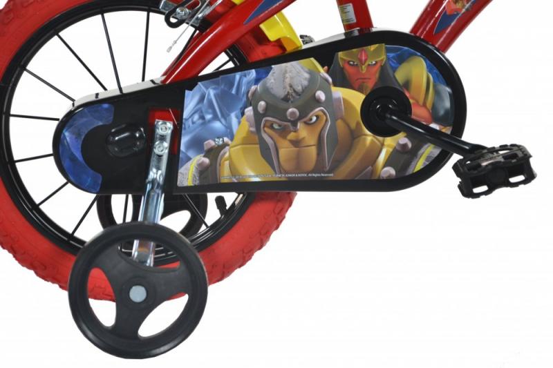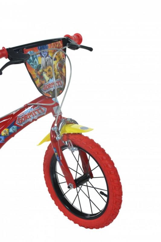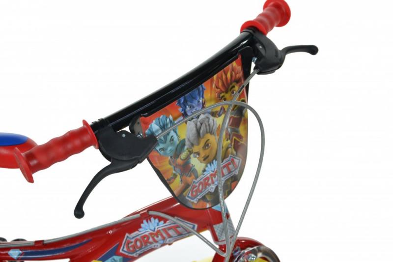 Dětské kolo Dino Bikes 614-GR Gormiti 14 má červeně rudý rám se žlutými doplňky a samolepkami Gormitů. Kolo má lakované ocelové ráfky 14" (14 palců = 35cm) a nafukovací pláště. Kolo je doporučeno pro výšku dítěte 95-115 cm a orientační věk dítěte 4-7 let. Maximální nosnost kola je 45 kg.Součástí balení jsou přídavná balanční kolečka, která jsou vhodná při učení rovnováhy na kole. Po získání jistoty při jízdě na kole je možné je kdykoliv odstranit a jezdit bez balančních koleček. Kolo má odlehčený rám z Hi-Ten oceli, přední a zadní čelisťovou brzdu, které se ovládají páčkami na řídítkách.