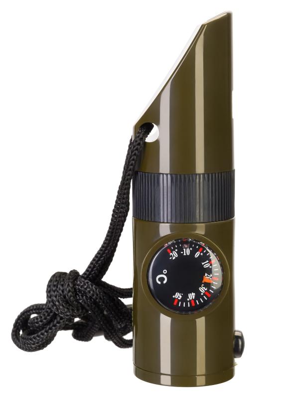 Kapesní multifunkční nástroj pro skauty, zálesáky, trampy, průzkumníky a dobrodruhy, vícedílné provedení 6v1 – píšťalka, teploměr, kompas, zrcátko, lupa a svítilna, napájení z 3V baterie CR1220, kompaktní rozměry a nízká hmotnost. Plast. Vojenská zelená. Zobrazit celý popis