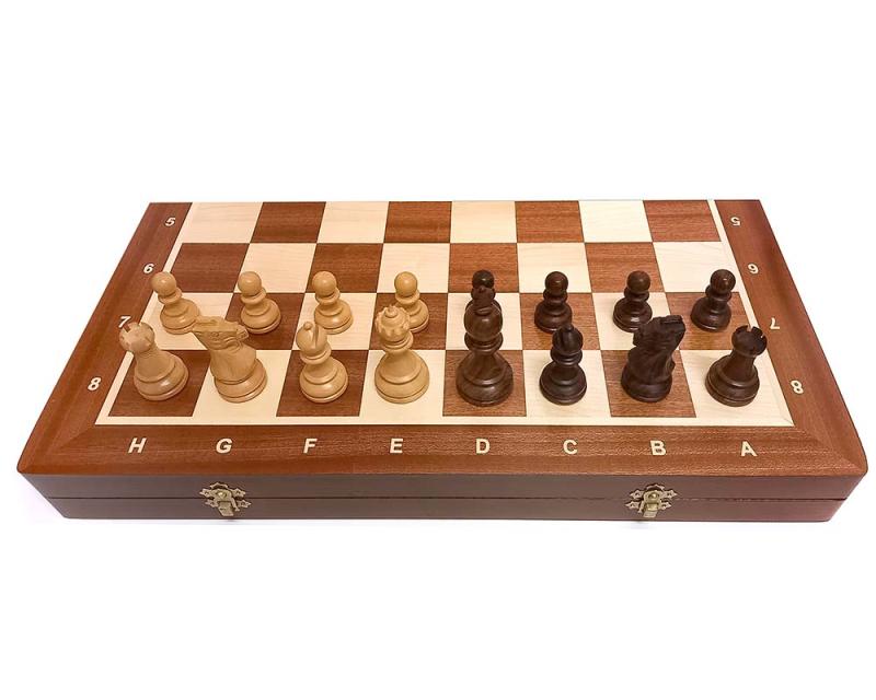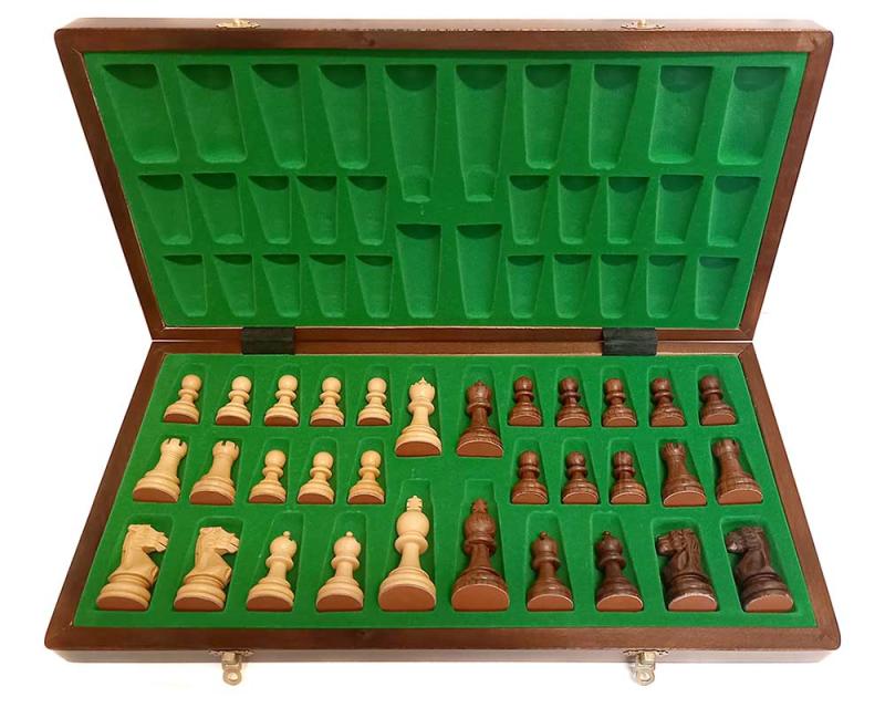 Součástí dodávky je skládací intarzovaná dřevěná šachovnice s popisem o rozměru 53x53. Lze ji složit na rozměr 53x26,5x6 a dovnitř lze uložit všechny figurky.