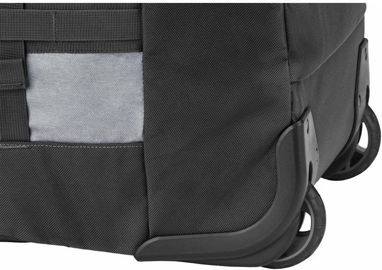 Odolné dno je polstrované pěnou, která chrání uložené věci před nárazy. Boční zpevněné úchyty umožňují upevnění tašky ke střešnímu nosiči vozidla. Dvě odolná kolečka s ochranným krytem zajišťují hladký pojezd i na nerovném povrchu. Obdélníkový tvar je ideální pro ukládání a skladování.