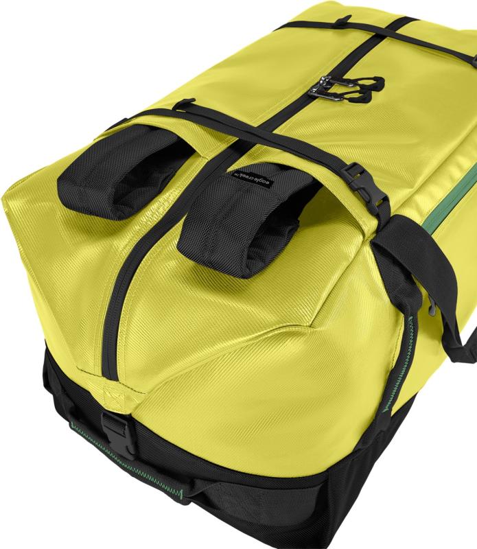 Můžete ji nosit v ruce jako běžnou cestovní tašku nebo díky dvěma vyztuženým ramenním popruhům pohodlně na zádech. Materiál 900D TPU je velmi odolný a díky hladkému povrchu se snadno čistí. Vnější voduodpuzující povlak je vyroben z recyklovaného materiálu získaného z ochranných fólií čelních skel automobilů, což zvyšuje odolnost a prodlužuje životnost tašky.