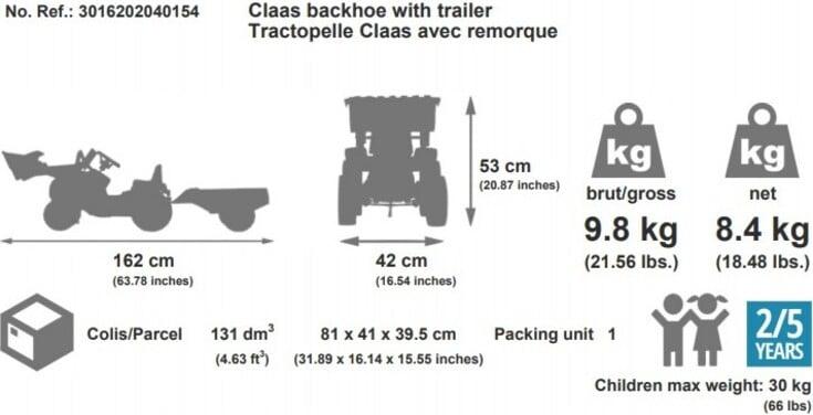 Súčasťou traktora je funkčný nakladač, ktorý deti môžu ľahko ovládať, a vlečka na prevoz drobných predmetov, čo rozširuje možnosti hry a podporuje kreativitu. Rozmery traktora s vlečkou sú 162 cm na dĺžku, 53 cm na výšku a 42 cm na šírku, čo zabezpečuje stabilitu a pohodlné ovládanie.