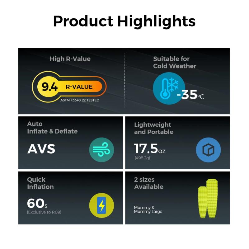 TINY Sleeping Pad R09 má hodnotu R=9,4. Je vytvořena pro extrémně chladné prostředí až do -35 °C. Poskytuje skvělou izolaci a teplo během zimních dobrodružství.