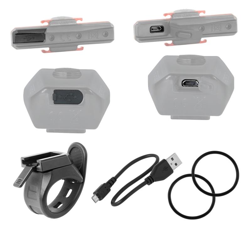 Tato sada obsahuje výkonnou USB dobíjecí přední svítilnu „Bug“ vybavenou vysoce svítivou LED Cree XP-GR5, která poskytuje široký a jasný kužel světla s šesti funkcemi svícení a blikání. Součástí je také dobíjecí zadní blikačka „Cob 16“ určená na sedlovku, která je velmi dobře viditelná i z bočního úhlu a na velkou vzdálenost. V balení najdete držáky na řídítka, sedlovku a dobíjecí USB kabel.