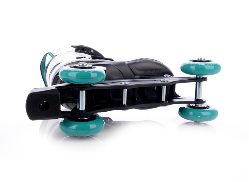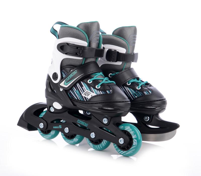 Tieto detské korčule predstavujú praktické riešenie pre rôzne spôsoby korčuľovania vďaka svojej unikátnej konštrukcii, ktorá umožňuje štyri varianty použitia v jednom modeli. Vďaka možnosti nastavenia veľkosti až o tri čísla rastú s rastom dieťaťa, čo predlžuje ich životnosť a šetrí náklady na nové korčule.\n\nŠtyri spôsoby jazdy v jednom produkte\n• Ľadové korčule s kovovým nožom vhodným pre zimné obdobie a korčuľovanie na ľade.\n• Inline korčule s kolieskami usporiadanými v rade pre plynulú a rýchlu jazdu.\n• Stabilizačný systém 2+2, teda dve kolieska vzadu vedľa seba a dve vpredu za sebou, ktorý pomáha začiatočníkom udržať rovnováhu.\n• Quad podvozok s dvoma kolieskami vpredu a dvoma vzadu vedľa seba, ktorý zvyšuje stabilitu a ponúka zábavný spôsob jazdy.\nPrestavenie medzi režimami je jednoduché a rýchle vďaka dodávaným dlhším osičkám a spacerom, ktoré umožňujú ľahkú výmenu podvozkov.\n\nPohodlie a bezpečnosť pri každej jazde\nKorčule sú vybavené mäkkou a rýchloschnúcou výstelkou, ktorá zabezpečí komfort aj počas dlhších výletov. Zapínanie kombinuje šnúrky, pracku a priehlavkový pásik na suchý zips, čo zaručuje pevné a bezpečné usadenie nohy a lepšiu kontrolu nad korčuľami.\nBrzda je vyrobená z materiálu TPR, ktorý umožňuje plynulé a dobre kontrolovateľné spomalenie, čo je dôležité pre bezpečnosť začínajúcich jazdcov.\n\nTechnické parametre a rozmery\n• Veľkosť koliesok: 64 mm (veľkosti 26-29, 30-33), 70 mm (veľkosti 34-37)\n• Dostupné veľkosti: EU 26–29, 30–33, 34–37\n• Dĺžka vnútornej vložky: 26-29 = 17,5-20,0 cm, 30-33 = 19,0-22,0 cm, 34-37 = 22,5-24,5 cm\n• Skelet: Hi-impact PP, 3-dielny\n• Vnútorný materiál: Vyztužený nylon/nylex s digitálnym potlačou\n• Podvozok inline: PP hi-impact s potlačou, systém pripevnenia ideal position control chassis\n• Tvrdosť koliesok: 82A\n• Ložiská: ABEC 5 carbon\n• Nôž: TEMPISH UNI CARBON steel - nerezová oceľ\n• Brzda: Áno\n• Systém zapínania: šnúrky, 1x pracka, 1x pásik na suchý zips\n• Nastavenie veľkosti: Áno\n• Maximálne zaťaženie: 60 kg\n\nOdporúčané použitie a kategórie\nUrčené pre rekreačné korčuľovanie a začiatočníkov, ktorí ocenia univerzálnosť a možnosť vyskúšať rôzne štýly jazdy v jednom produkte. Kategória fitness zodpovedá zameraniu na aktívne trávenie voľného času.\n\nVďaka týmto korčuliam získate multifunkčné vybavenie, ktoré rastie s dieťaťom a ponúka variabilitu použitia bez nutnosti zaobstarať viac párov. Sú ideálne pre rodičov hľadajúcich praktické a pohodlné riešenie pre rozvoj detských korčuliarskych zručností.\n\nKľúčové vlastnosti\n• Univerzálny 4in1 systém umožňuje korčuľovať na ľade, inline, s podporou stability i v štýle quad.\n• Rastúca veľkosť vďaka jednoduchému nastaveniu až o 3 čísla.\n• Pohodlná výstelka z rýchloschnúceho materiálu pre dlhší komfort.\n• Bezpečné zapínanie kombinujúce šnúrky, pracku a suchý zips.\n• Kontrolovateľná brzda z TPR materiálu pre bezpečné spomalenie.\n\nTento model je praktickou voľbou pre deti, ktoré chcú objavovať rôzne spôsoby korčuľovania, a pre rodičov, ktorí hľadajú funkčný a dlhodobo využiteľný produkt. Vyskúšajte všestrannosť a pohodlie, ktoré tieto korčule ponúkajú.