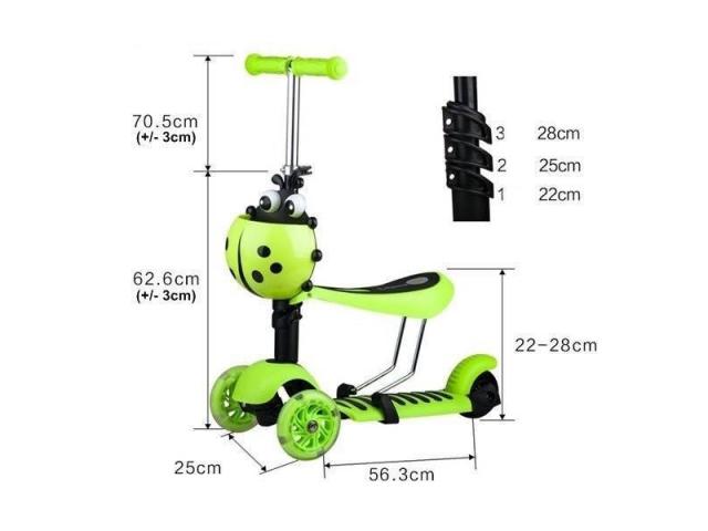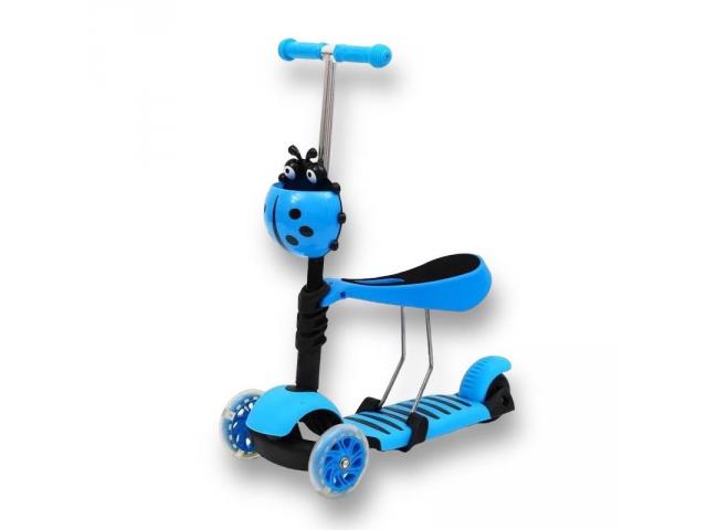 Tato dětská koloběžka je navržena tak, aby doprovázela vaše dítě během různých fází jeho vývoje díky třem jízdním režimům. Disponuje odnímatelným sedátkem a praktickým košíkem ve tvaru berušky, které zvyšují její funkčnost a atraktivitu pro malé jezdce. Blikající LED kolečka vyrobená z odolného polyuretanu nevyžadují nabíjení a zajišťují viditelnost při jízdě za šera či večer.