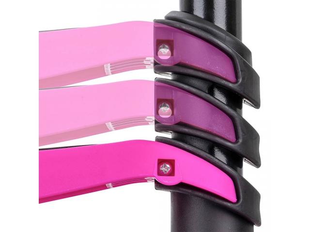 Koloběžka je vybavena nastavitelnými řídítky ve třech výškových úrovních (64, 69 a 74 cm od země), což umožňuje přizpůsobení podle výšky dítěte. Nastavitelná je také výška sedátka (22, 25 a 28 cm), díky čemuž koloběžka skutečně „roste“ s dítětem. Široká a stabilní plošina s protiskluzovou úpravou poskytuje bezpečné a pohodlné postavení během jízdy. Konstrukce je zpevněná, materiály kombinují plast (PP, PU) a ocel, což zaručuje pevnost a dlouhou životnost.