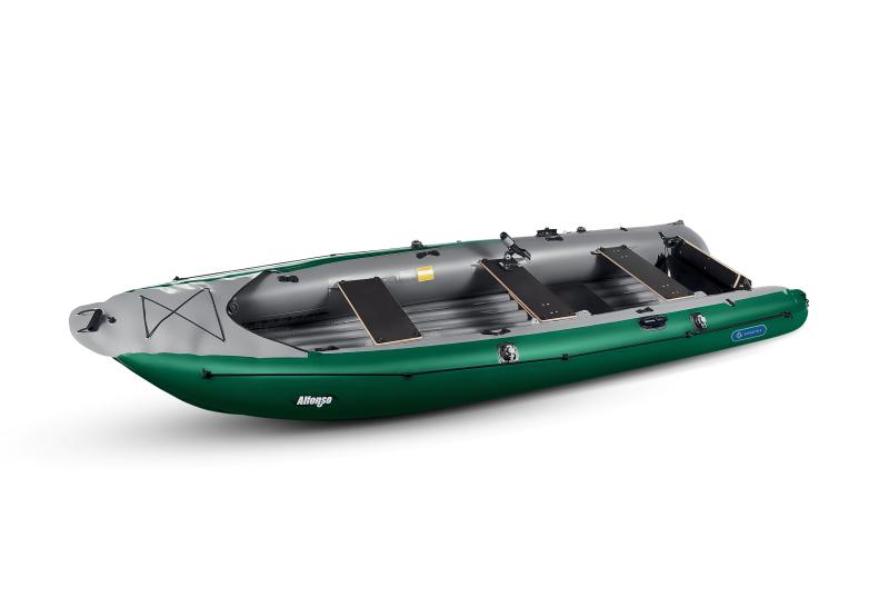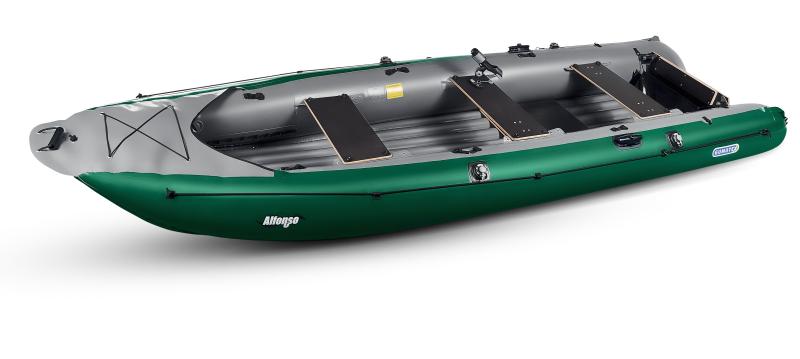 Alfonso je všestranný nafukovací člun vhodný pro rybáře, rodiny i výlety po různých typech vod. Délka 430 cm a šířka 125 cm poskytují dostatek prostoru pro tříčlennou posádku s nosností až 410 kg. Robustní zadní zrcadlo umožňuje montáž motoru s výkonem do 5 hp (3,7 kW). Pět úchytových základů a držáky prutů Cannon usnadňují upevnění rybářské výbavy. Loď si udržuje stabilní jízdu i ve vlnách a snadno drží kurz bez nežádoucího driftování.