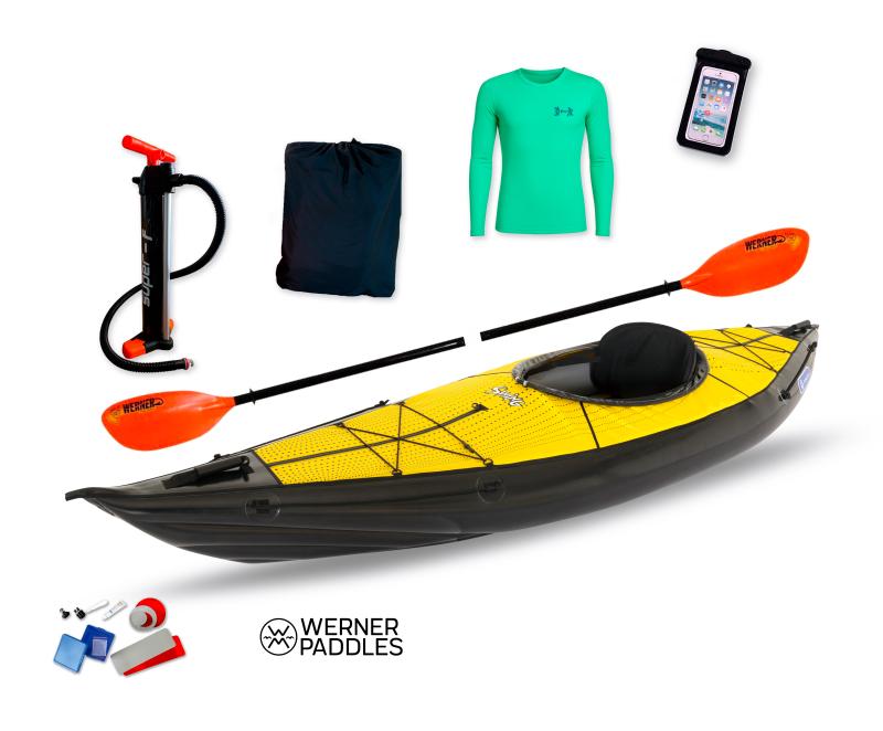 Součástí je nafukovací kajak Swing 1 od značky Gumotex, který je navržený jako jedno-místná loď s uzavřenou palubou (deck). Díky délce 316 cm a šířce 87 cm poskytuje vysokou stabilitu a jistotu při pádlování, zároveň umožňuje výbornou manévrovatelnost v užších tocích i dobré držení směru na klidných vodách.
