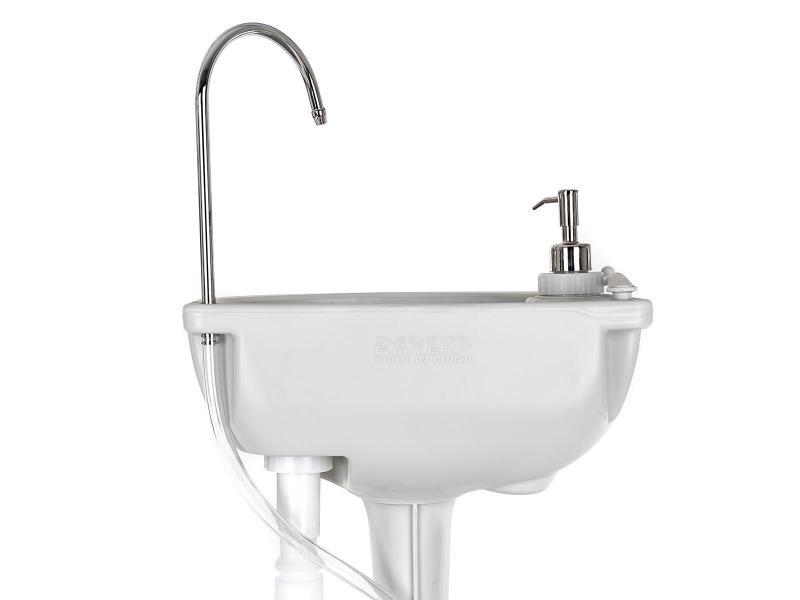 Umývadlo je vybavené zásobníkom na čistú vodu s objemom 17 litrov, ktorý umožňuje dostatočnú zásobu tečúcej vody na umývanie rúk. Súčasťou je tiež integrovaný zásobník na tekuté mydlo s objemom 3 litre a praktický háčik na zavesenie uteráka, čo zvyšuje komfort používania.