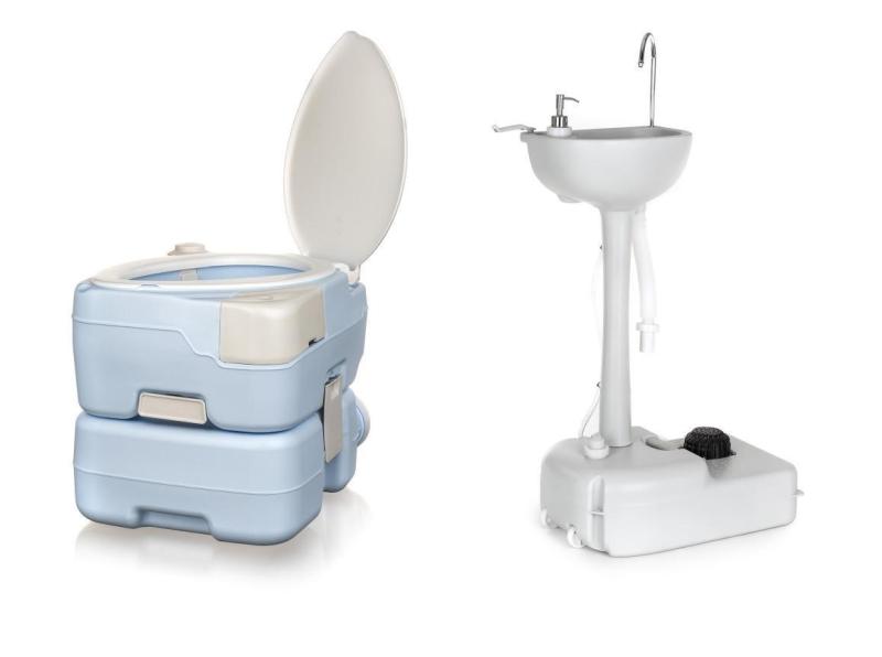 Set produktov za zvýhodnenú cenu. Prenosná chemická toaleta s objemom 15 l ponúka pohodlnú sedaciu výšku, spoľahlivé splachovanie a praktickú priehradku na toaletný papier či telefón.