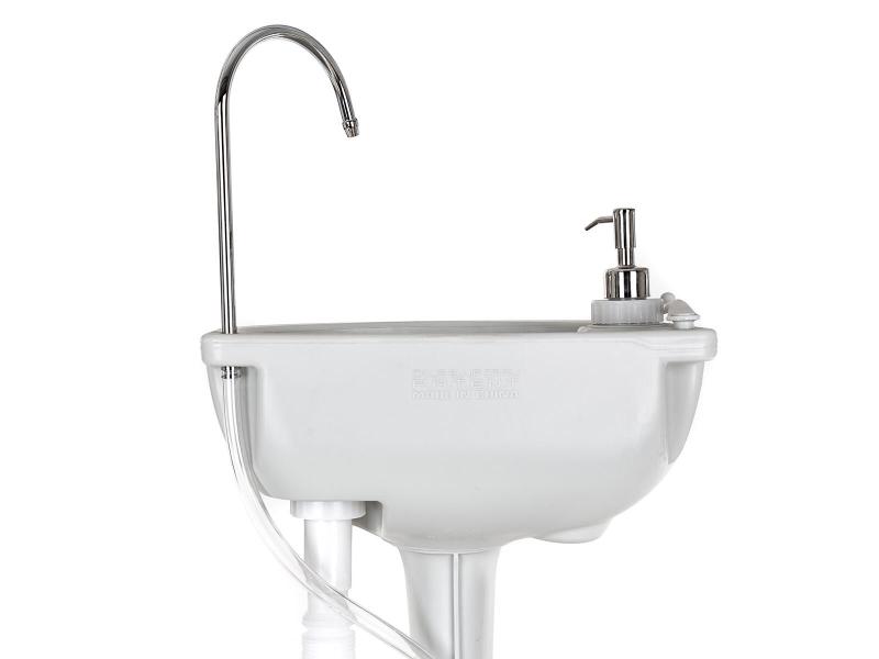 Umývadlo je vybavené zásobníkom na čistú vodu s objemom 17 litrov, ktorý umožňuje dostatočnú zásobu tečúcej vody na umývanie rúk. Súčasťou je aj integrovaný zásobník na tekuté mydlo s objemom 3 litre a praktický háčik na zavesenie uteráka, čo zvyšuje komfort používania.