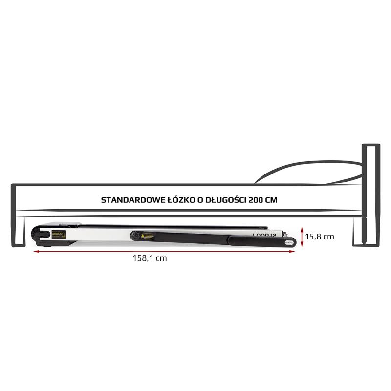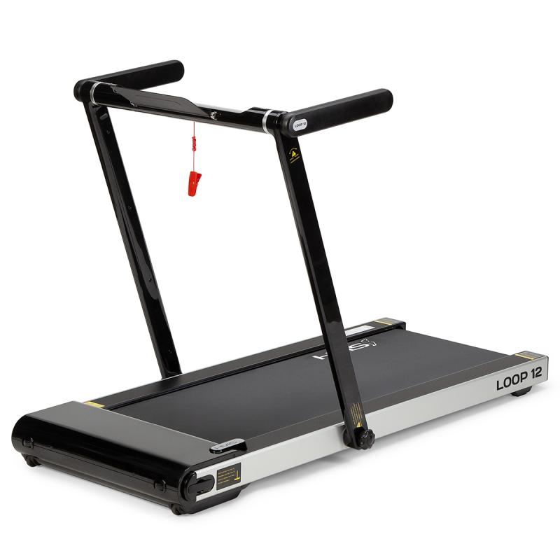 Elektrický bežecký trenažér HMS LOOP12 má moderný dizajn a po zložení zaberá veľmi málo miesta.\nMaximálna rýchlosť trenažéra je 12 km/h, motor má špičkový výkon 2,5 HP. Bežecká plocha s rozmermi 125 x 45 cm je na 6 miestach odpružená pomocou silikagélových silentblokov, ktoré znižujú zaťaženie kĺbov pri behu. Konzola sa dá jednoducho skloniť k zadnému okraju trenažéra a po sklopení získame rozmer 158 x 77 x 14 cm a trenažér sa tak zmestí za skriňu alebo pod posteľ. Presúvanie modelu LOOP12 navyše uľahčujú 2 páry koliesok. Prvý pár sa nachádza na spodnom okraji a po zdvihnutí zadnej časti pásu umožňujú pohyb vpred a vzad. Druhý pár koliesok sa nachádza na čele trenažéra a po jeho zdvihnutí do zvislej polohy umožňujú pohyb do strán.\nOvládací panel zobrazuje všetky dôležité údaje počas tréningu (rýchlosť, čas, vzdialenosť, spálené kalórie a počet krokov). Po stranách displeja nájdeme tlačidlá na zastavenie a spustenie pásu, reguláciu rýchlosti a 2 tlačidlá na skokovú zmenu rýchlosti na 3 a 5 km/h. Počítač tiež disponuje rozhraním bluetooth pre spojenie s tréningovou aplikáciou FitShow, pomocou ktorej môžeme sledovať vývoj našej kondície a zároveň nám umožňuje nastavenie tréningového programu, podľa ktorého trenažér automaticky mení rýchlosť bežeckej plochy.\nKonzola je vybavená reproduktormi pre počúvanie hudby alebo sledovanie filmov na mobilnom zariadení, ktoré si môžete odložiť do sklápacieho stojančeka.\n\nParametre:\n\n- Výkon motora: 1,25 HP (špičkový 2,5 HP)\n- Maximálna rýchlosť: 12 km/h\n- Rozmer bežeckej plochy: 125 x 45 cm\n- Bluetooth pre spojenie s mobilným zariadením a aplikáciou FitShow\n- Vstavané reproduktory\n- Bezpečnostný kľúč\n- Rozmery po zložení:\n\n- dĺžka: 152 cm\n- šírka: 77 cm\n- výška: 103 cm (15,8 cm pri sklopenom madle)\n- Váha: 43 kg\n- Maximálne zaťaženie: 120 kg\n\nFunkcie počítača:\n\n- Čas\n- Rýchlosť\n- Vzdialenosť\n- Spálené kalórie\n- Počet krokov\nĎalšie informácie:\n\n- Záruka 24 mesiacov\n- Nie je určené na komerčné použitie\n- Názvy a ochranné známky sú majetkom príslušných vlastníkov. Tento produkt nie je priradený k vlastníkom uvedených značiek, nie je nimi sponzorovaný ani nimi autorizovaný. Prístup k službám môže vyžadovať účet a/alebo predplatné.