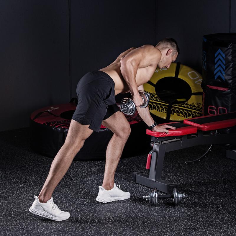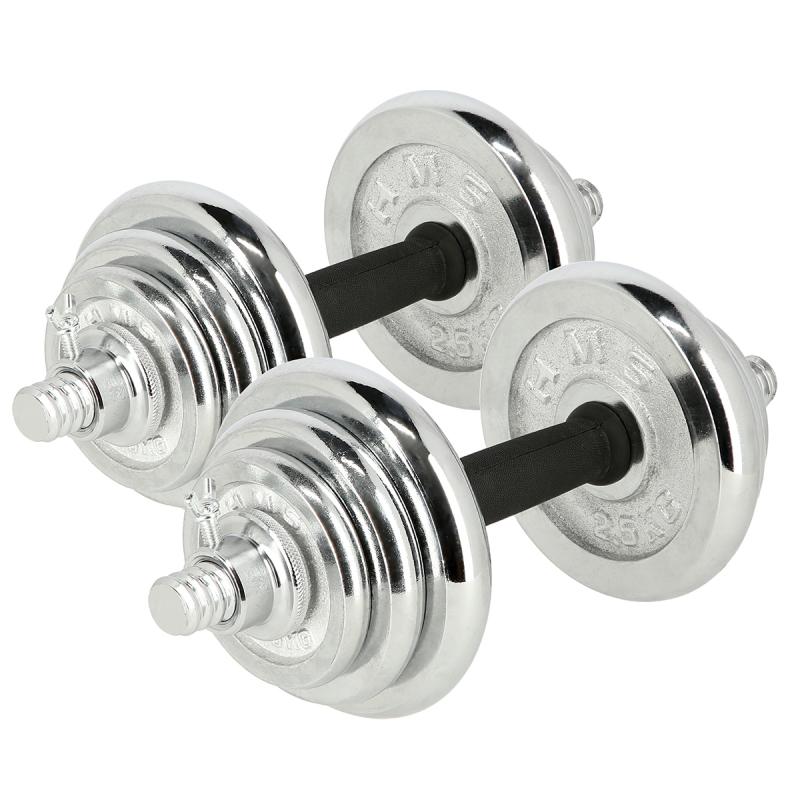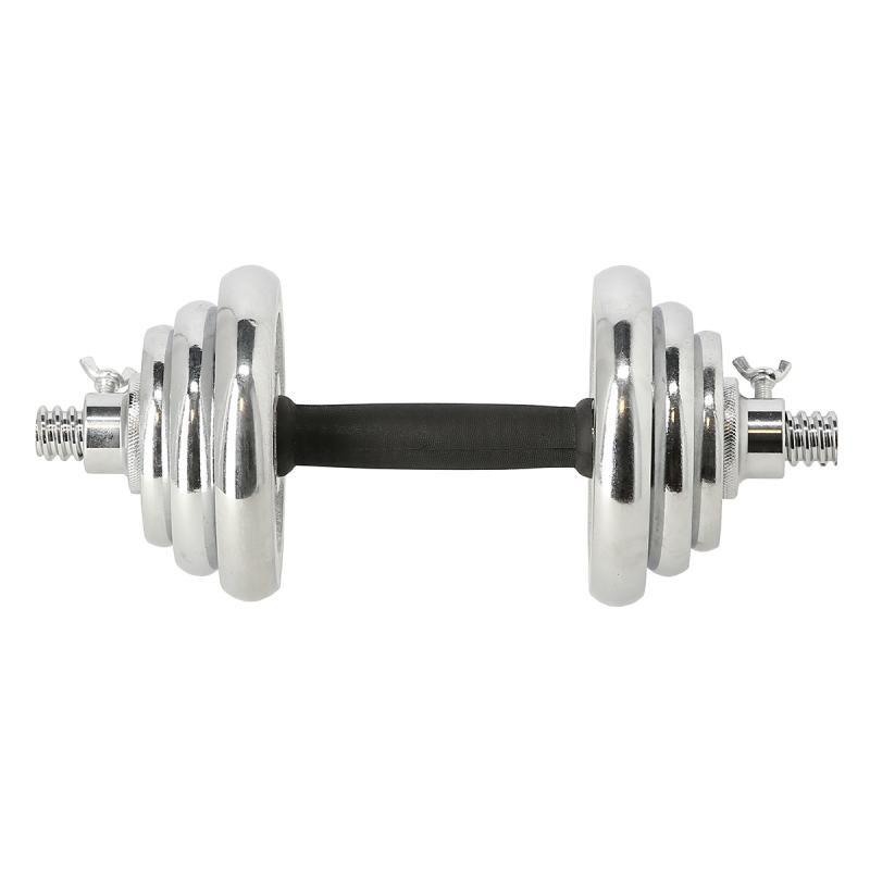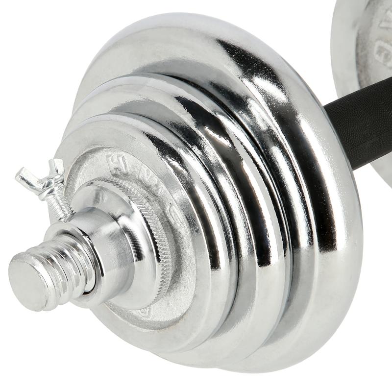 Činky sú vyrobené z vysoko kvalitnej, chrómovanej ocele, ktorá je zárukou dlhej životnosti. Kotúče sa proti posunutiu zabezpečujú skrutkovacími zámkami, ktoré sú dodatočne zaistené skrutkou s krídlovou maticou.