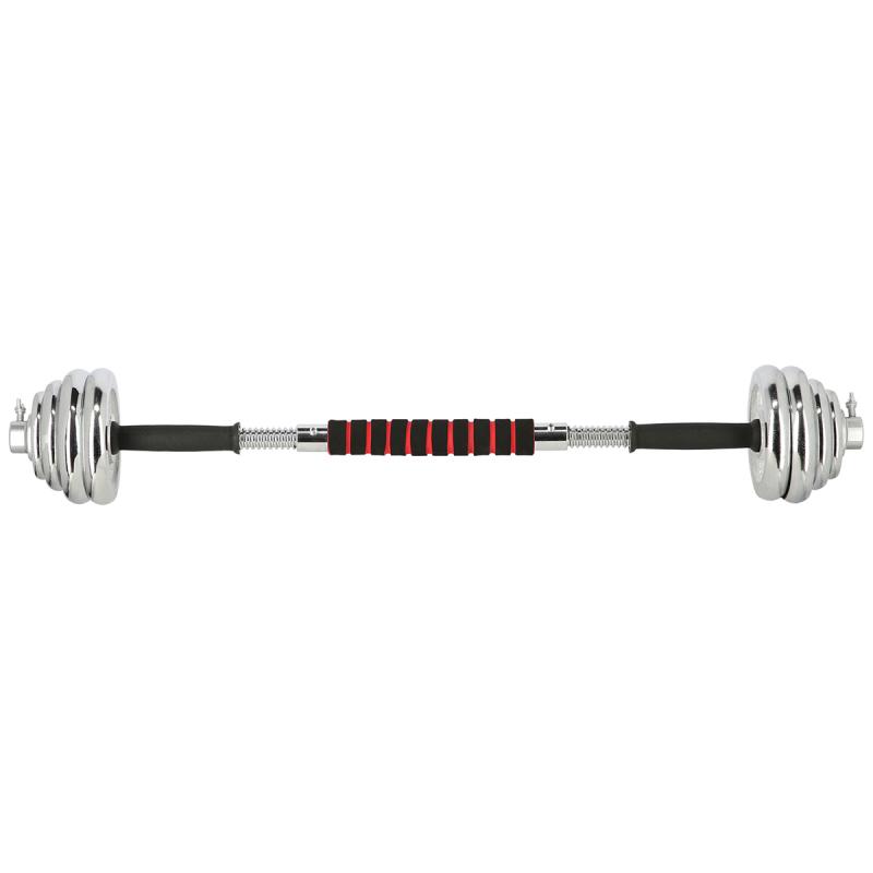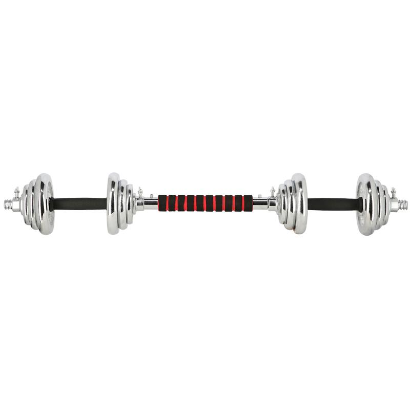Špeciálny spojovací diel je po stranách opatrený závitmi, do ktorých sa jednoducho zaskrutkujú obe činky, toto riešenie šetrí náklady a miesto vo Vašej domácej posilňovni. Sada obsahuje 2 krátke, nakladacie osi opatrené ergonomickým úchopom, spojovací diel, 4 zámky a 12 kotúčov.