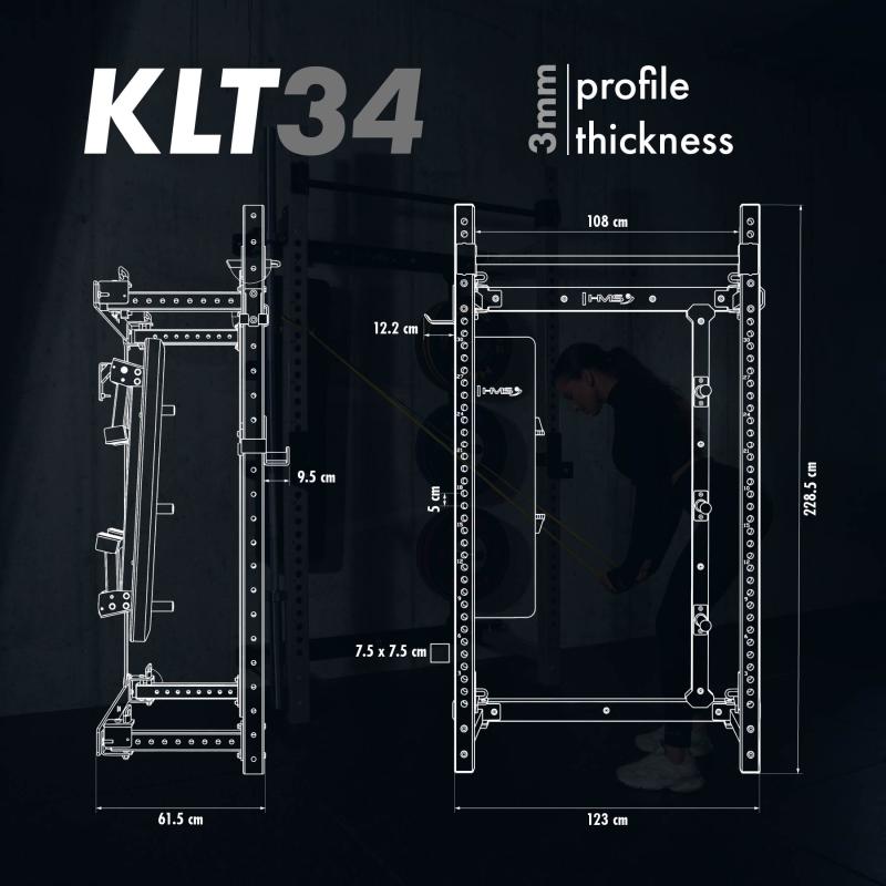 Na rozdíl od klasických skládacích power racků se model KLT34 skládá a rozkládá horizontálně do stran. Díky tomu jej lze pohodlně používat i v místnostech s omezenou výškou stropu.Po dokončení tréninku lze konstrukci snadno složit ke stěně, čímž: