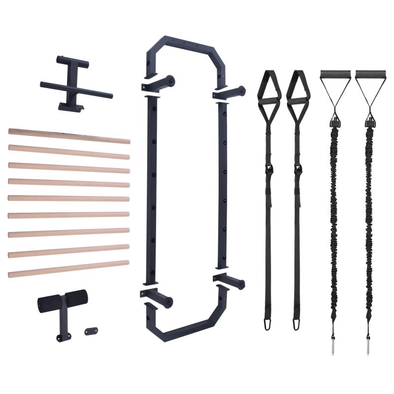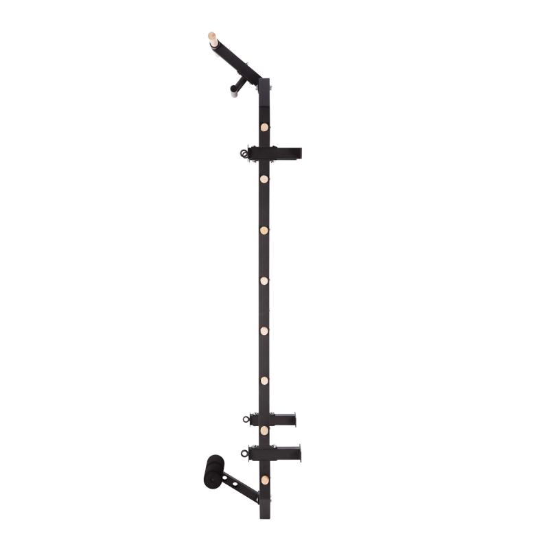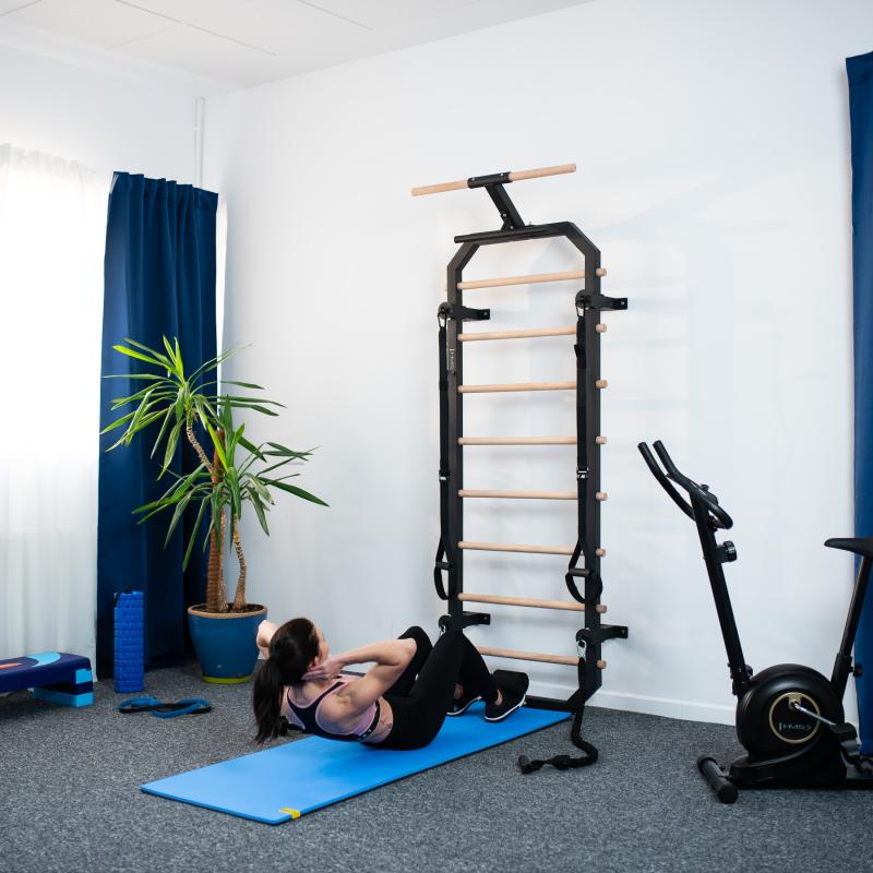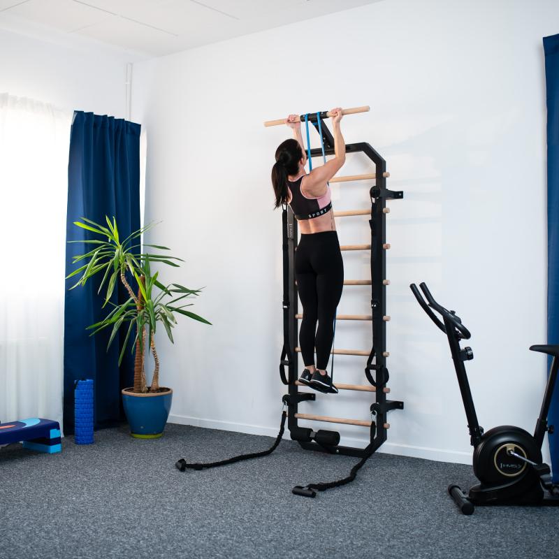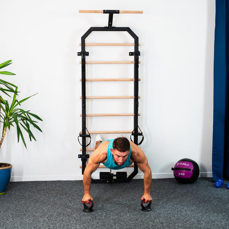 Multifunkční konstrukce Příčky z bukového dřeva se po instalaci do žebřiny zajišťují šroubem ze zadní strany konstrukce, takže pevně drží na svém místě a neprotáčí se. V horní části žebřin se nachází 80 cm široká hrazda a kovová "polo hrazda" která slouží například k instalaci popruhů, nebo expandérů, ty lze také připevnit k ocelovým okům na 4 vzpěrách. Ve spodní části se nachází zarážka nohou pro trénink sed-lehů. Pro maximální pohodlí jsou zarážky opatřeny pěnovými válci.