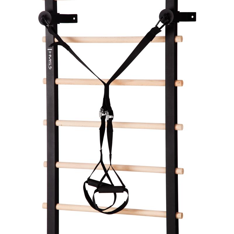 Multifunkční žebřiny HMS DW2708 jsou ideální náčiní pro domácí trénink. Sada se skládá z gymnastických žebřin, které se připevňují ke zdi, 2 expandérů zakončených úchopem a 2 tréninkových popruhů s nastavitelnou délkou. Produkt je vyroben z kvalitní oceli a má 8 příček z bukového dřeva. Žebřiny jsou 223 cm vysoké a 80 cm široké.