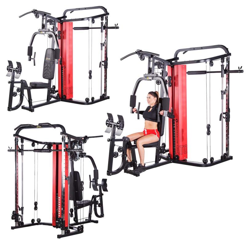 ATOM v sobě snoubí multipress, dvě posuvné kladky, rameno na tlaky / motýlka, leg press a hrazdu, takže jde o skutečně komplexní stroj. Součástí dodávky je také dvojité, tricepsové lano, tricepsový adaptér, popruhy ke kladkám a opasek na kotník.