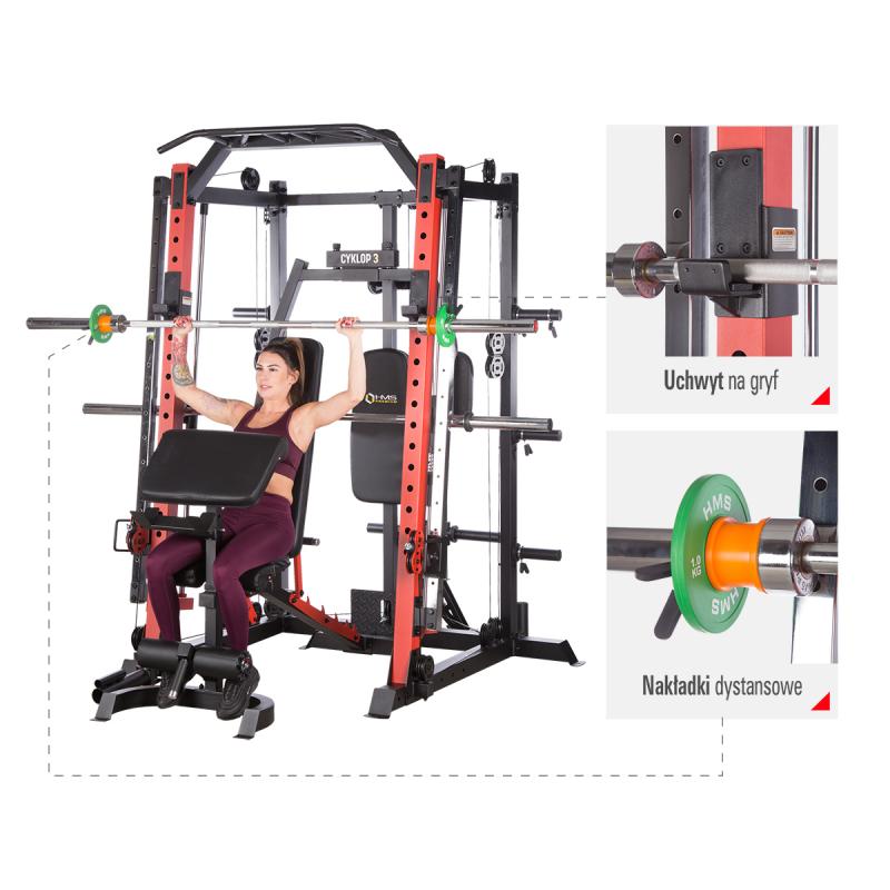 CYKLOP 3 je kombinací multipressu, hrazdy, motýlka, stojanu na osu a dvou posuvných kladek. Spojením všech prvků do jednoho celku získáme univerzální zařízení, které umožňuje trénovat všechny svalové skupiny. Efektivitu tréninku a jeho možnosti zvýší přiložené příslušenství v podobě adaptérů ke kladkám (dvojité tricepsové lano, úzký, lomený adaptér, popruh na kotník a nylonové popruhy s madlem), výškové nastavitelné DIP adpatéry, háky pro odložení osy a multiosý kloub (takzvaný landmine). Hlavní osa je opatřena pěnovým návlekem pro maximální pohodlí během tréninku dřepů. Dorazy multipressu jsou tvořeny pružinami, které pohltí většinu energie při nouzovém upuštění osy.