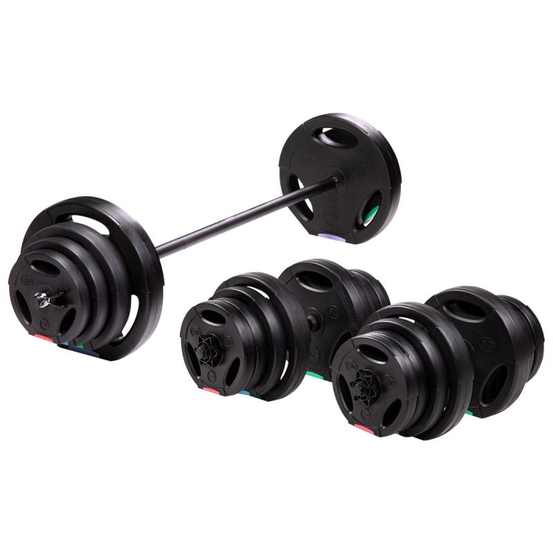 Sada obsahuje jednoruční a obouruční činky s kotouči z cementem vyplněného plastu o celkové hmotnosti 62 kg, vhodné pro domácí posilovny. zobrazit celý popis