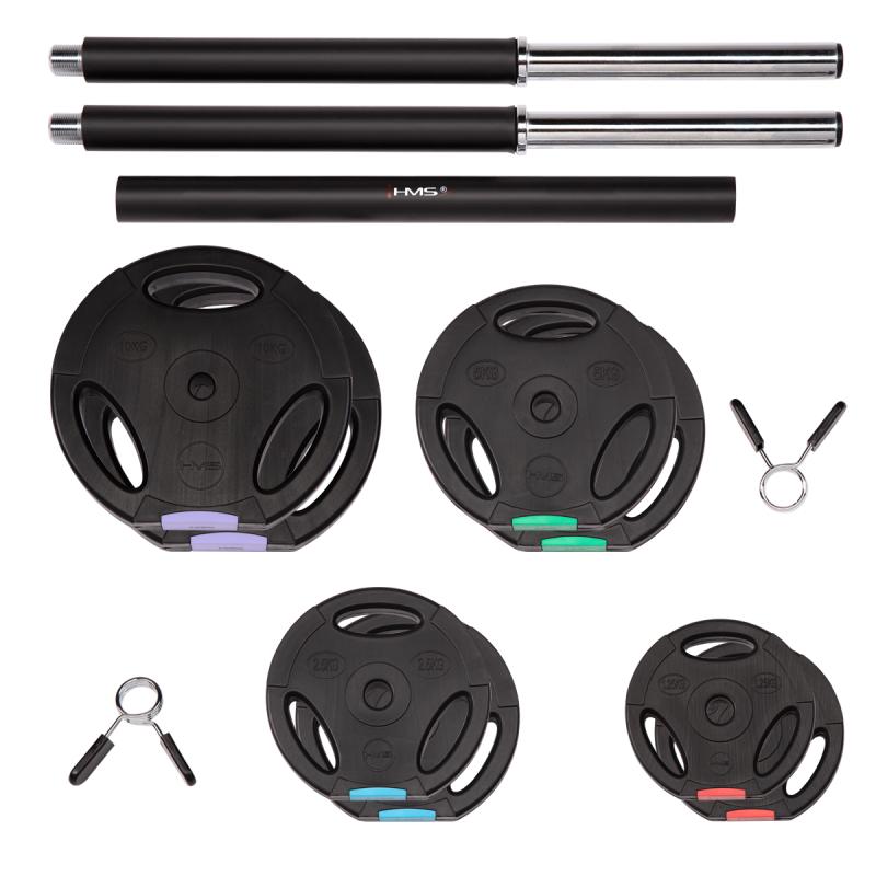 Sada obsahuje 1 obojručnú os, 2 pružinové svorky a celkovo 8 kotúčov rôznych hmotností.