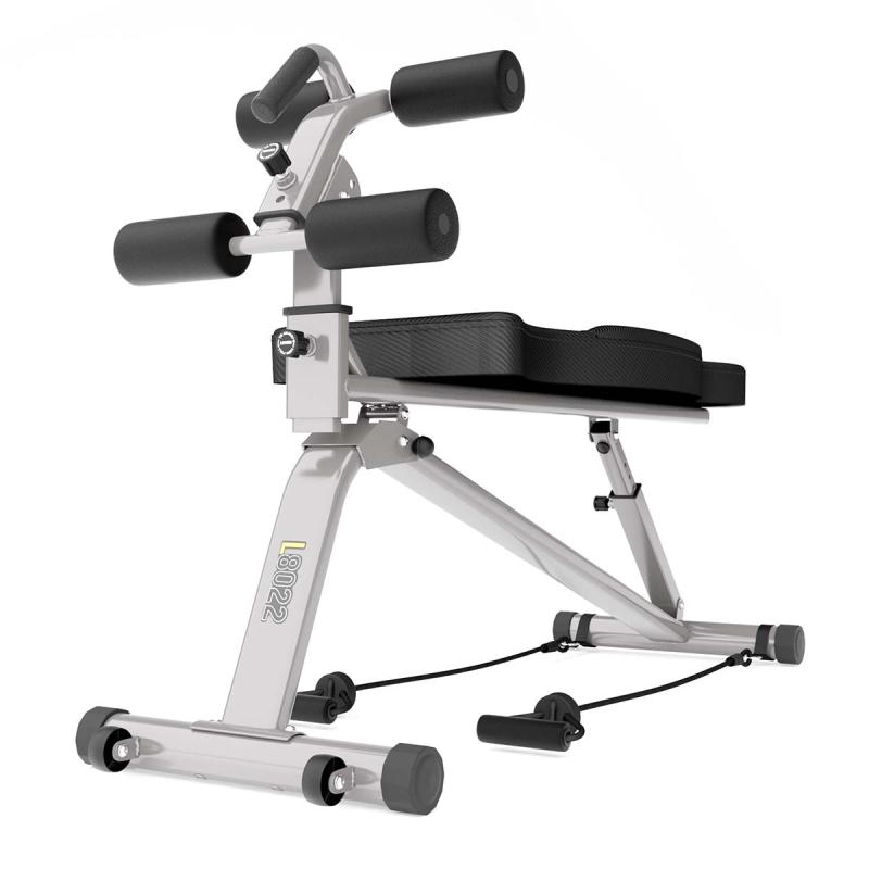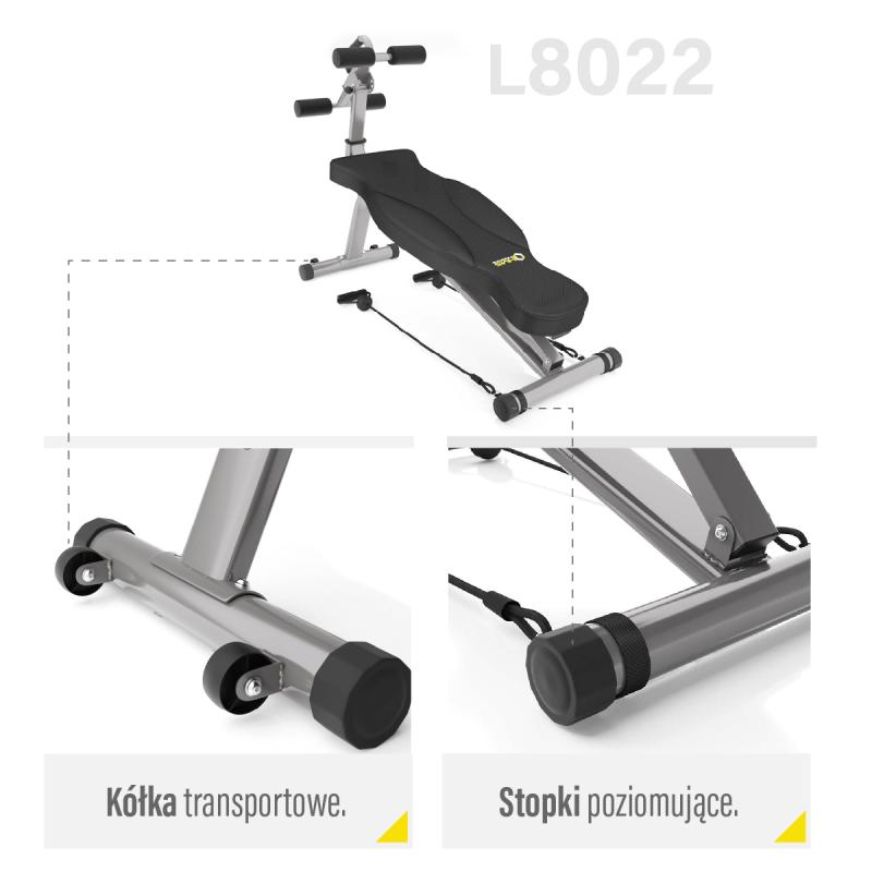 Zádová opěra je nastavitelná do 5-ti poloh (1 rovná a 4 v negativním sklonu). Opěra ve vodorovné poloze je ideální k provádět většinu cviků s činkami, pokud se opěra nastaví do negativního úhlu, pak získáme šikmou lavici k posilování břicha, k tomuto účelu je L8022 vybavena nastavitelným, výsuvným rámem se zarážkami, který je výskově nastavitelný do 3 poloh a 4 úhlů, zarážka nohou je nastavitelná do 3 vzdálenosti. Rám tak představuje hlavní přednost lavice a umožňuje precizní nastavení pro každou postavu, trénink sedů lehů tak bude bezpečný a pohodlný.