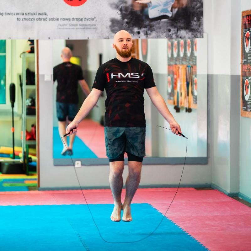 Crossfitové švihadlo HMS SK49 je vybaveno ocelovým lankem, které lze díky šroubům nastavit na libovolnou délku. Rotační hlavice osazené ložisky předcházejí zamotání lanka.