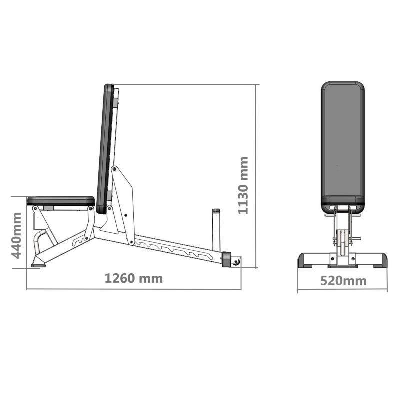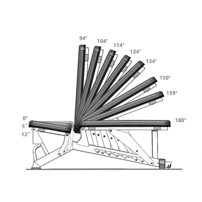 Lavice L1237 nabízí 3 úrovně nastavení sedáku a 8 úrovní nastavení opěradla. Rozsah úhlu opěradla je od 94° do 180°, což umožňuje trénink v různých polohách – svislé, vodorovné i šikmé. Díky tomu můžete efektivně procvičit různé svalové partie, od hrudníku přes záda až po ramena, a přitom si zachovat maximální pohodlí.