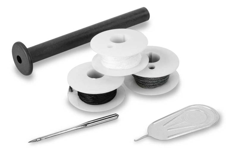 Příslušenství: špulka s nitěmi 3x, náhradní jehla 1x, nástavec na velké cívky 1x, navlékač 1x