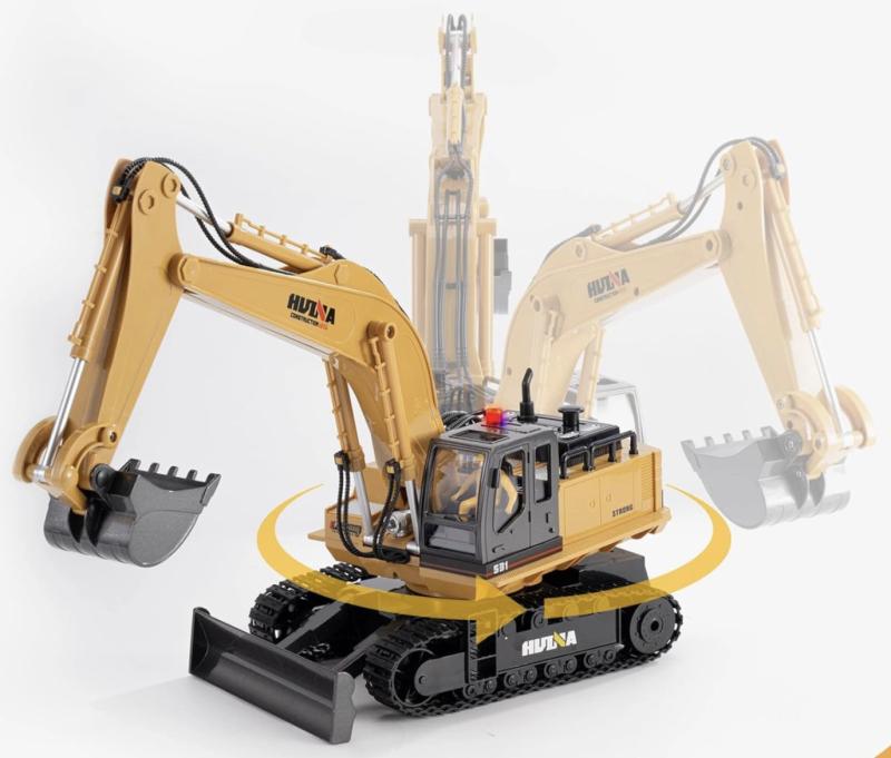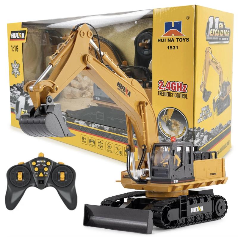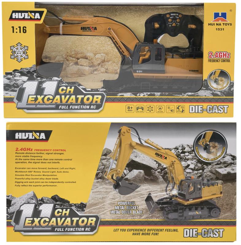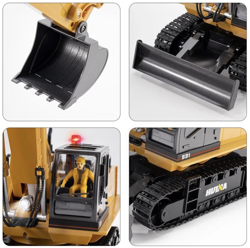 Huina RC pásový bagr s radlicí a kovovou lžící 1:16 Nová verze s majákem a figurkou