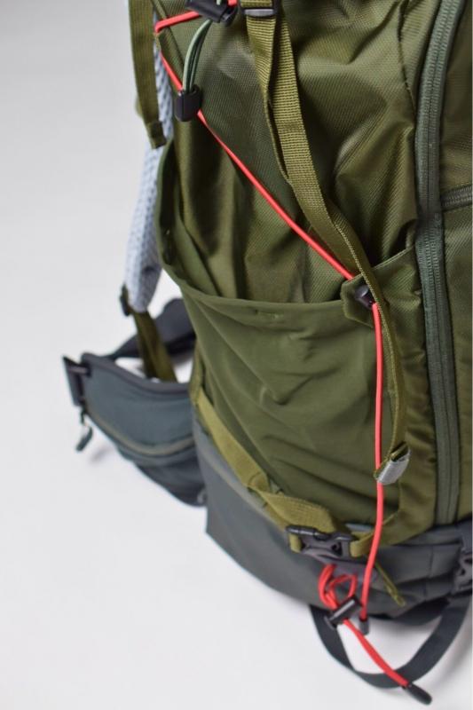 • Vrecká a úchyty: dve hlavné komory, predný vstup, predné vrecko na zips, bočné elastické vrecká, úchyty na trekové palice, otvor a uchytenie na vodný vak
