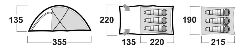 • Rozměry stanu (Š × D × V): 220 × 370 × 135 cm
