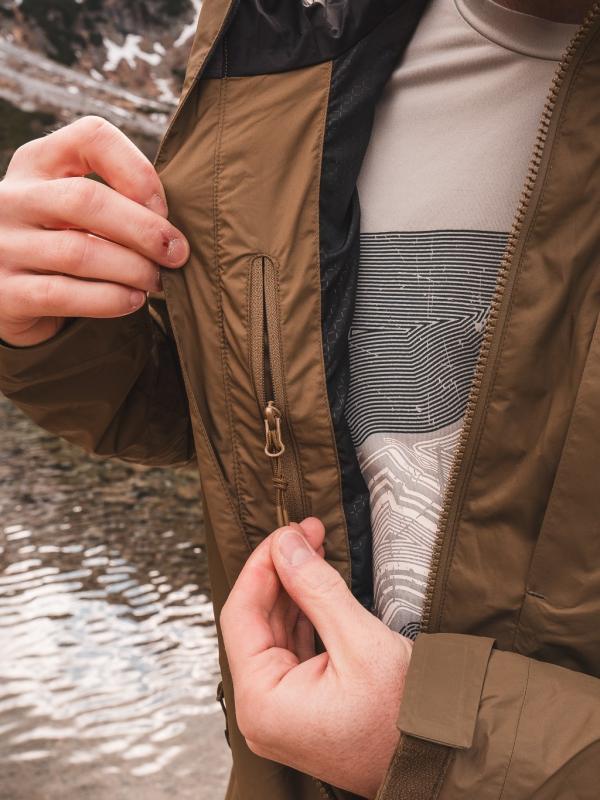 Ďalšie praktické detaily bundy zahŕňajú kompletne podlepené švy, ktoré zabezpečujú neprepustnosť, ľahkú sieťovanú podšívku v hornej časti a vodoodpudivú polyesterovú podšívku v dolnej časti tela pre lepší odvod vlhkosti a komfort. Vodeodolné zipsy na hlavnom zipsu i vreckách zabraňujú prenikaniu vody dovnútra. Pre väčšie pohodlie je bunda vybavená prekrytím zipsu pri brade, odvetrávaním v podpazuší na zips a predĺženým zadným dielom, ktorý chráni chrbát.