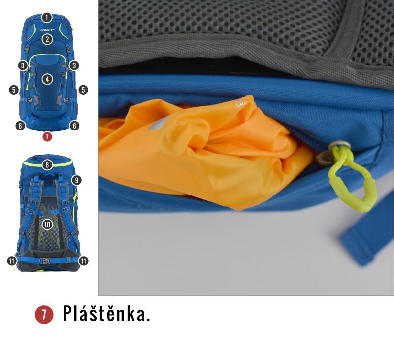 • Výbava batohu Sloper:1 hlavní komora s přední kapsou a přidaným bočním vstupem, boční síťované kapsy, boční kompresní popruhy, hrudní a bederní popruh, nepromokavé zipy, úchyty na trekové hole či jinou výbavu, elastická fixace pro vybavení na víku, příprava pro vodní vak, pláštěnka, reflexní prvky.