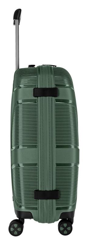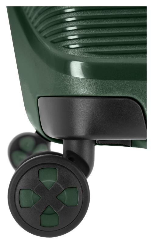 Štvorkolesový skořepinový kufor s integrovaným TSA zámkom, vymeniteľnými kolieskami a vodoodpudivým zipsom vyrobený z čiastočne recyklovaného polypropylénu.