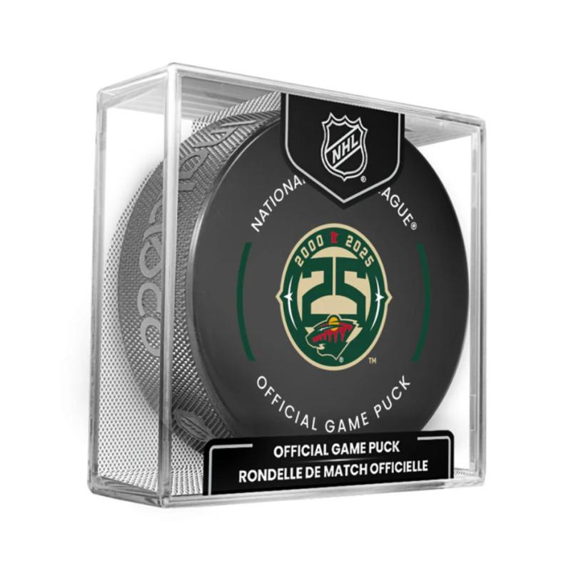 Oficiálny puk k 25. výročiu Minnesota Wild s termoreaktívnym logom NHL, ktoré pri zmrazení mení farbu na fialovú, uložený v prezentačnej akrylátovej kocke.