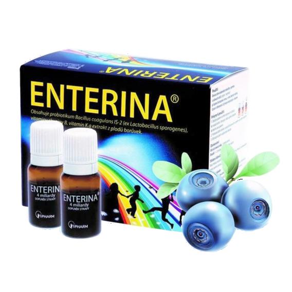 Doplnok stravy s obsahom probiotického kmeňa Bacillus coagulans, extraktu z plodov čučoriedok, vitamínu K a vitamínov skupiny B, ktoré prispievajú k udržaniu fyziologického stavu slizníc (vitamíny B2, B3), normálnemu energetickému metabolizmu (B6, B12) a k zníženiu miery únavy a vyčerpania (napr. vitamíny B2, B6, B12). Vďaka extraktu z čučoriedok je navyše Enterina® veľmi chutná, a deti zaujme aj praktická, hravá forma fľaštičiek.