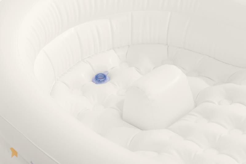 Podpůrný výstupek v bazénku pomáhá zabránit sklouznutí dítěte, čímž přispívá k jeho bezpečnosti během koupání. V balení najdete také ruční pumpu, která usnadní nafukování a přípravu bazénku k použití.