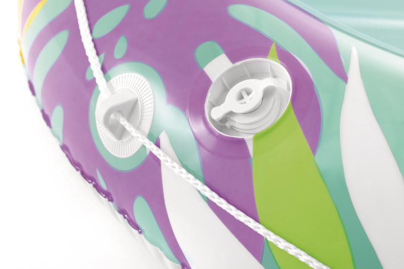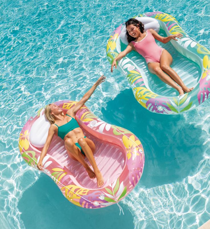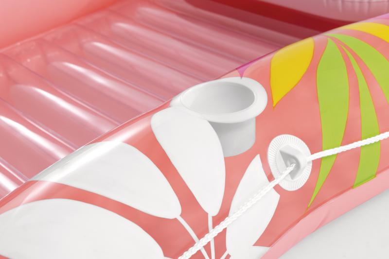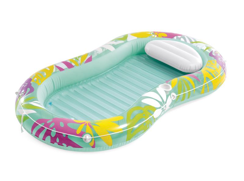 Nafukovací lehátko Tropical Oasis je navrženo pro pohodlnou relaxaci na vodní hladině díky zvýšenému okraji a praktickému polštářku pod hlavu, který zajišťuje lepší oporu během odpočinku.